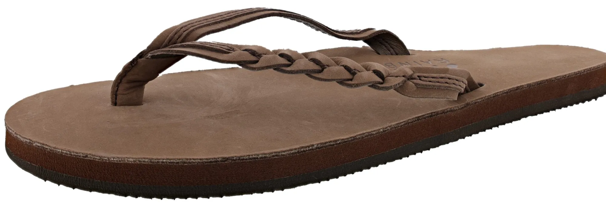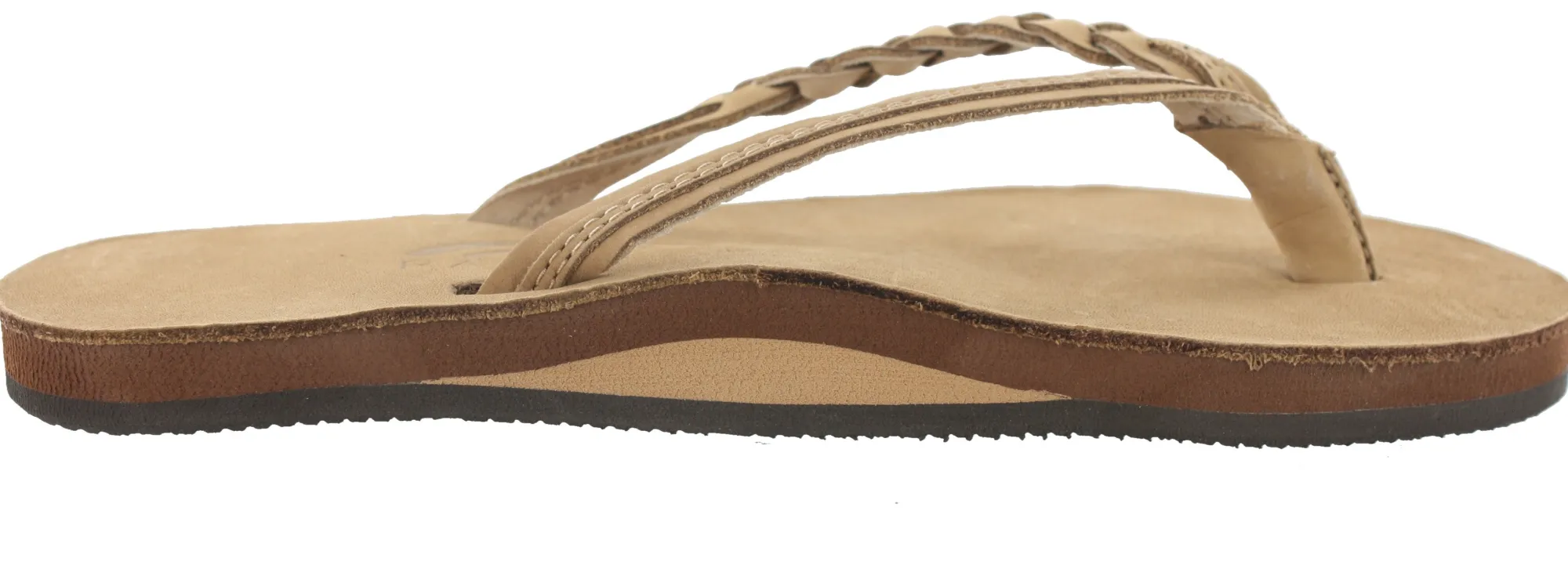 The narrow strap has an asymmetrical design featuring a braid on the outside straps and top stitched leather trim on the inside straps. The toe piece is our new V style construction and is wrapped with soft leather for comfort. The right sandal proudly displays the Original Rainbow woven label.