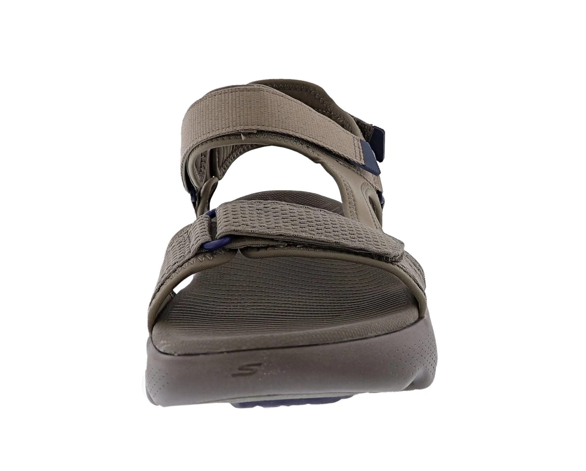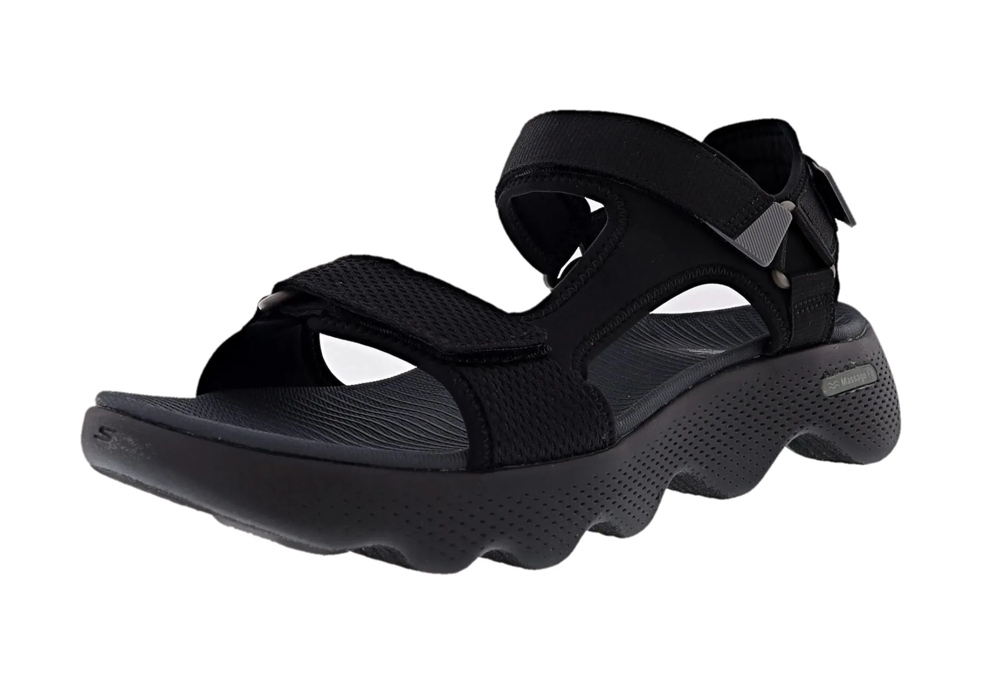Step into waves of comfort wearing Skechers GO WALK Massage Fit Sandal. This innovative river sandal design features a woven ripstop strap upper with adjustable hook and loop closures, an ultra-lightweight, responsive HYPER BURST cushioned midsole and a contoured Goga Mat footbed.