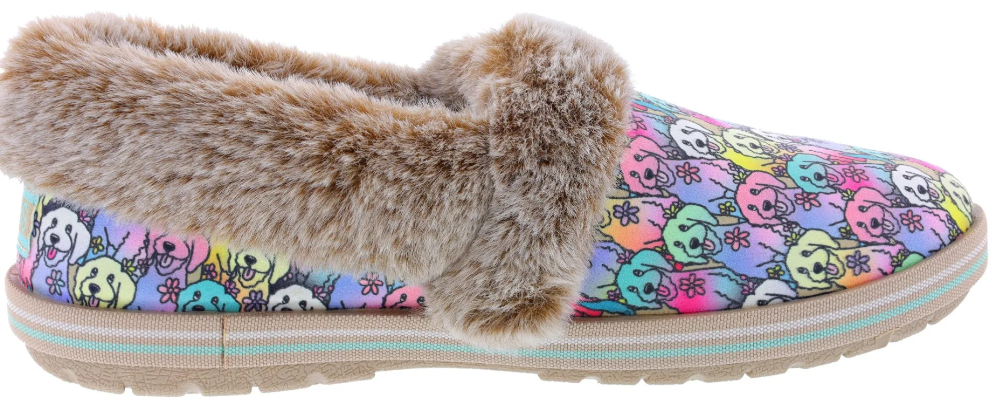 Get styled in Skechers house shoes comfort this season with the BOBS from Skechers Too Cozy – Winter Howl shoe. This cozy slipper features a soft fabric upper with allover ”Aloha Doodle” print, faux-fur trim and cushioned house slippers memory foam.