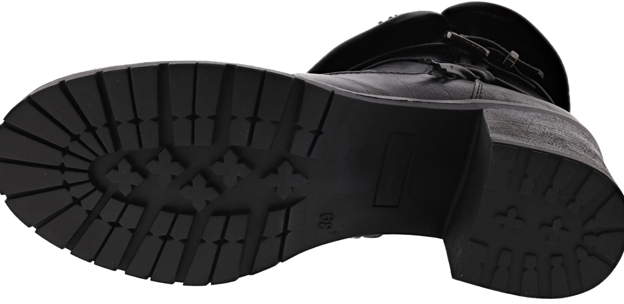 Patricia Steppe Side Zip Closure chunky heeled boots with a fold-down collar beautiful plaid and a crossed ankle strap. Adjustable buckle and studs on a loop knot on a black chunky heeled boots. Closure Buckle Zipper Comfort Flexible Sole Padded Insole Vegan Friendly.